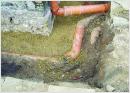 Bild 4: Dachrinnenfallrohre und parallel zum Bauwerk verlaufende Leitungen sollten nicht durch die BENTOFILL Dichtmischung geführt werden. Besser ist es diese Leitungen hinter der Dichtmischung durch den Füllboden zu führen (siehe Bild). Rohrdurchführungen, die aus dem Gebäude heraus durch die Dichtmischung verlaufen sind vor dem Einfüllen des BENTOFILL besonders einzubetten, dazu eignet sich unser Quellsand QuellMix CP. Dieses Produkt ist besonders hoch mit Bentonit vergütet und einbaufertig auch als Sackware erhältlich. Füllen Sie QuellMix CP rund um das Rohr und verdichten Sie manuell (z. B. mit einem Handstampfer, Hammer etc.).