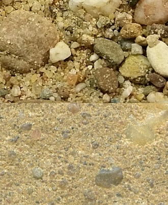 Oben: Korngerüst 0/16 mm als Ausgangsmaterial, lose geschüttet. Eine spezielle, güteüberwachte Sieblinie entsprechend der aktuellen Beton-Norm gewährleistet hohe Festigkeiten/Scherfestigkeiten. Unten: BENTOFILL 0/16 ST Fertigmischung im verdichteten Zustand. Neben einem natürlichen, hochquellfähigen Bentonit enthalten alle BENTOFILL ST-Mischungen zusätzlich einen inerten Füller, der eine hohe Dichtigkeit auch bei etwaigem Quellverlust des Bentonits (z.B. in Schwermetall belasteten Böden oder durch Salzfrachten) gewährleistet. Durch den Aufbau Korn an Korn bleibt das Komprimat auch bei völliger Austrocknung volumenstabil. |