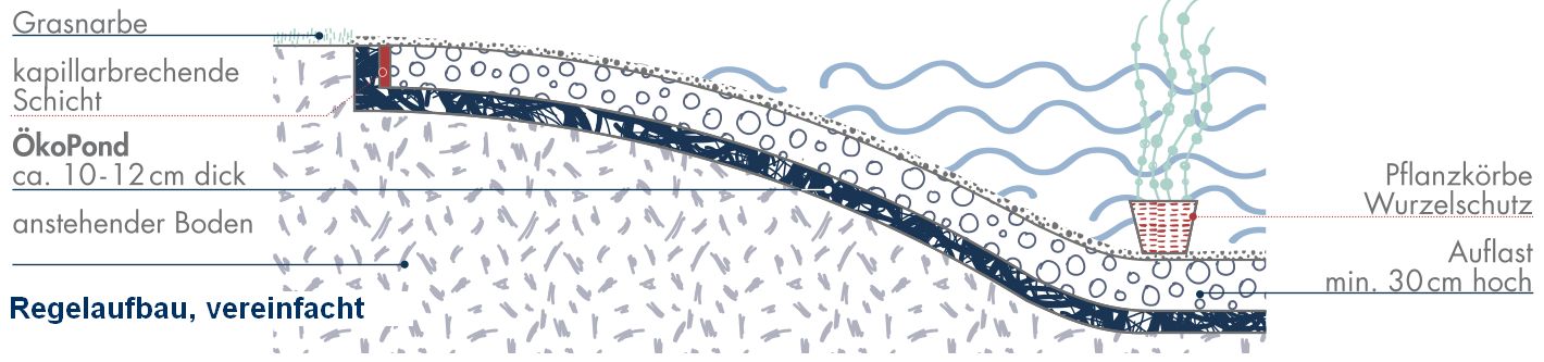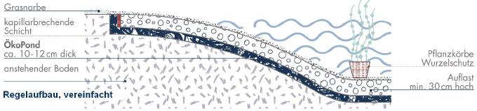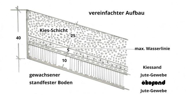 Der Regelaufbau ist denkbar einfach: Bedingung für eine ÖkoPond-Dichtung ist ein fester, tragfähiger Untergrund, frei von humosen Stoffen, die Böschungsneigung sollte nicht mehr als 1:3 betragen. Zur Lagentrennung kann z.B. ein Jute-Gewebe ausgelegt werden, um das Vermischen mit dem Untergrund zu verhindern.